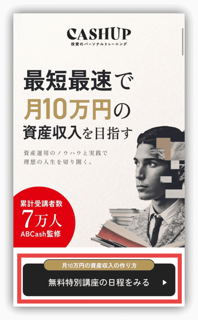 CASHUPとは、最短・最速で資産収入UPを目指せる「投資に特化したマンツーマンのトレーニング講座」だよ。