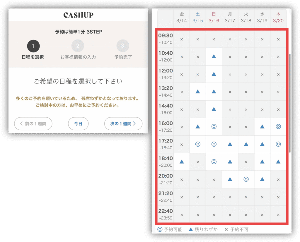 3週間後までの空き状況を確認できるから、早めに予約すれば希望の時間を取りやすいよ!