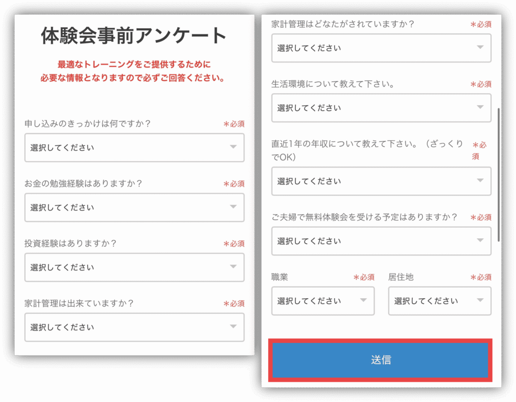 このあと事前アンケートが出てくるから、上から順に当てはまる選択肢を選ぼう!