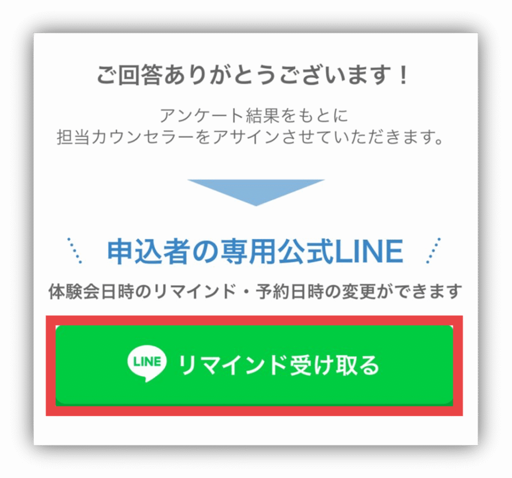 アンケートの回答が終わったらLINE登録の案内が出てくるから、「リマインド受け取る」をタップしてLINE登録してね。